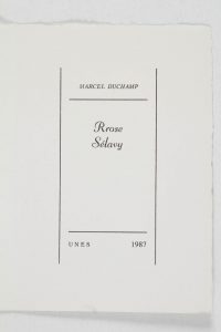 DUCHAMP Marcel.Rrose Sélavy. Le Muy, Éditions Unes, 1987. In-12, br. Réédition à 33 exemplaires + quelques h.c. à l’identique de l’originale (G.L.M. 1939).