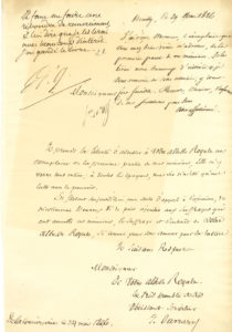 1 page in-fol..Ouvrard, en prison pour dettes, envoie à S.A.R. le Duc d’Orléans « un exemplaire de la première partie de mes mémoires, Elle m’y verra tout entier ; à toutes les époques, ma vie n’a été qu’une lutte avec le pouvoir »….Louis-Philippe a noté en haut de la page : « Il faut me faire une réponse de remerciment, & lui dire que je les lirai avec beaucoup d’intérêt. J’ai gardé le livre ». À côté de cette apostille, minute du projet de réponse daté du 29 mai.
