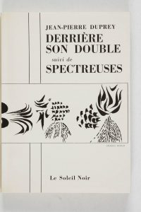 DUPREY Jean-Pierre.Derrière son double, suivi de Spectreuse. Lettre préface d’André Breton. Paris, Le Soleil Noir, 1964. Pt in-8, br. sous emboîtage. Édition en partie originale. 1/50 sur pur fil avec une eau-forte en couleurs de Jacques...