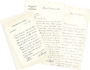 enveloppe..Intéressante correspondance politique. 7 juin 1907, remerciant Herriot de sa confiance…24 avril 1914, à propos du problème délicat de se faire accompagner dans ses tournées en province par sa femme : on a reproché au Président de la République de « restaurer des coutumes monarchiques »… 22 avril 1922, explications sur la mise au point qu’il a fait publier, à la suite de remous dans le cabinet, concernant l’envoi d’un homme politique français aux Soviets ; « je me suis borné à faire dire, ce qui était la stricte vérité, qu’aucun homme politique ne m’avait demandé une mission en Russie et qu’aucun n’en avait reçu une. Cette note, dans ma pensée, était loin de vous viser ; elle démentait simplement l’existence d’une mission », et était « uniquement destinée à nier que le gouvernement eût l’intention d’avoir des négociations avec les Soviets » ; la rédaction a dû en être trop maladroite… 27 août 1927, sur le projet de décorer en même temps Frédéric Lefèvre et Maurice Martin du Gard, rédacteur en chef et directeur des Nouvelles littéraires, « de beaucoup le journal littéraire le plus important »… 11 janvier 1928, remerciements pour le beau discours sur Zola… 3 mars, réticences sur l’opportunité de répondre aux « critiques rétrospectives » dont Herriot est « trop souvent l’objet » ; Poincaré recommande quelques modifications au communiqué d’Herriot… 11 octobre : les articles 70 et 71 insérés dans la loi des finances à la demande du ministre des Affaires étrangères ne portent « aucune atteinte aux principes de laïcité »… 11 novembre, au lendemain de la démission d’Herriot du ministère de l’Instruction publique, le Président du Conseil regrette « une collaboration qui m’avait été si agréable et qui avait été si utile pour le pays »… 30 juin 1933, remerciant pour la lettre-préface d’Herriot à l’ouvrage de Georges Samué sur Poincaré… D’autres lettres à propos de protégés, affaires académiques, publications diverses, etc..On joint une L.S. d’Émile Roche, du journal La République, au sujet de Poincaré (1938).