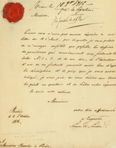 octobre 1816, à M. Ravrio à Paris ; 1 page in-4 en français..Il lui demande une réponse au sujet des dessins des garnitures pour des surtouts.de table...