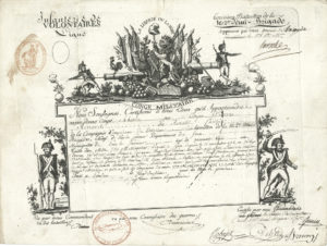 RÉVOLUTION. 11 P.S., ans III-X ; la plupart oblong in-fol., plusieurs vignettes ou encadrement décoratif gravé, et cachets de cire rouge (quelques fentes)..Congés militaires ou certificats, signés par des conseils d’administration de...