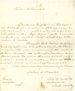 suite un feu de cheminée pour la pauvre malade... Weimar 5 novembre 1795, au duc de Castries : lettre de condoléances après la mort de la duchesse de Castries, espérant « qu’un changement heureux dans votre patrie puisse avec le tems adoucir et vous faire oublier la douleur profonde sans laquelle vous êtes plongé »... Eisenach 16 juillet 1796, à la maréchale de Castries : il se désole qu’une famille aussi respectable et intéressante quitte leurs contrées....On joint une l.a.s. de sa femme, la grande-duchesse Louise de Saxe-Weimar, Weimar 17 juillet 1796, à la maréchale de Castries, regrettant son départ d’Eisenach.