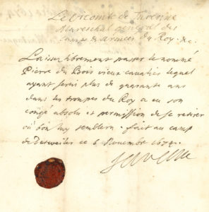 Henri de La Tour d’Auvergne, vicomte de TURENNE (1611-1675) maréchal de France. P.S., au camp de Detweiler 6 novembre 1674 ; 1 page in-4, cachet de cire rouge aux armes..Laissez-passer pour Pierre du Bois « vieux cavalier lequel ayant servi...