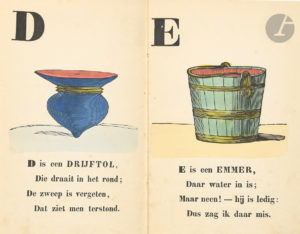 Une lettre par page, initiale en tête à gauche, large gravure sur bois mise en couleurs soulignée de quatre vers en forme de comptine. Un double feuillet avec alphabets en différents styles, signes de ponctuation et chiffres complètent l’ouvrage avant le catalogue de Theodore Bom de livres d’enfants et d’abécédaires.