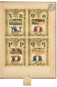 Quatre lettres par planche (pas de W), lithographiées en noir et en couleurs sur fond beige. Pour chacune des initiales quatre typographies différentes et un encadrement végétal au centre duquel une ouverture carrée a été pratiquée et qui laisse apercevoir l’initiale ornée en rouge ou en bleu. En actionnant la bande de carton placée en pied vers le bas, l’occurrence chromolithographiée légendée apparaît. Abécédaire uniquement constitué d’animaux dont les noms sont à épeler.