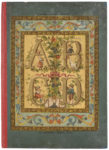 chromolithographié et doré dans un double encadrement orné sur fond bleu-vert, lettres A, B, C, D accompagnées d’enfants et d’animaux, motif floral au centre, catalogue de l’éditeur sur le second.