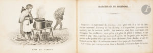 Les séduisantes gravures ne sont pas mises en couleurs, mais cet exemplaire sur les petits métiers de Paris reste peu courant et très bien conservé, deux petites restaurations en marge du dernier feuillet.