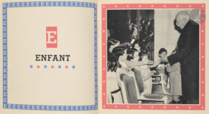 ABÉCÉDAIRE — Édité par le Bureau de documentation du chef de l’état. 1943. Draeger, imp. Montrouge. In-12 carré (14 x 14 cm). (56) pp. : couvertures de papier fort bleu, blanc, rose, francisques argentées sur la première, francisque...