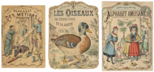 Trois ouvrages d’imagerie coloriés au pochoir.
