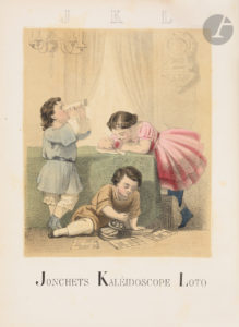 [Vers 1855]. [Lithographies] Imp. Lemercier Paris. [Texte] Imp. Simon Raçon et comp, rue d’Erfurth, 1. In-12 (17,5 x 13 cm). 1 frontispice, (42) pp., 7 planches lithographiées en couleurs : cartonnage de l’éditeur de papier crème lithographié en couleurs et à l’or, titre entouré d’enfants et de lettres, encadrement orné et motif géométrique central sur le second plat, titre sur le dos.