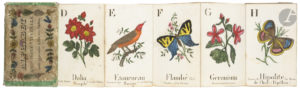 ALPHABET D’HISTOIRE NATURELLE pour apprendre à lire aux enfants. — Sans adresse, ni lieu, ni date. [Vers 1853]. (13,2 x 8,5 cm). Leporello de (24) planches gravées et coloriées au pochoir : cartonnage de l’éditeur de papier vert clair,...
