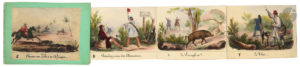 [ALPHABET DE LA CHASSE]. — Sans adresse, ni lieu, ni date. [Vers 1840]. (11,6 x 16,5 cm). Leporello de (23) planches lithographiées, mises en couleurs au pochoir et au pinceau, rehaussées à la gomme arabique : cartonnage de l’éditeur de...