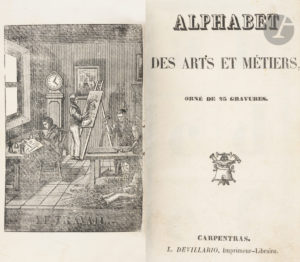 ALPHABET DES ARTS ET MÉTIERS. — Orné de 25 gravures. L. Devillario-Libraire. Carpentras. [1841]. In-12 (17,5 x 11 cm). 70 pp. : reliure de papier ocre à motifs géométriques bordeaux, titre sur le dos. (Reliure moderne).
