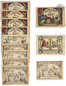 ALPHABET DES ENFANTS SAGES. — N° 1. Le Petit Poucet. — Pellerin & Cie. Epinal. [1874]. In-16 oblong (10,1 x 14,5 cm environ). (16) ff., couvertures comprises, imprimés en recto : couvertures de papier lithographiées et coloriées au...