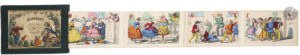 ALPHABET DES JOIES DE L’ENFANCE. — Wentzel, Edit. Rue St Jacques 65. Paris. [Vers 1830]. (12,3 x 17 cm). Leporello de (14) planches lithographiées et mises en couleurs au pochoir : cartonnage de l’éditeur de papier chagriné vert lierre,...
