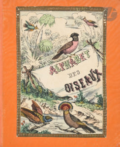 ALPHABET DES OISEAUX. — Imp. Lith. Pellerin. Epinal. [En pied du feuillet S]. [Vers 1865]. (17 x 14 cm). Leporello de (24) planches lithographiées et coloriées au pochoir : cartonnage de l’éditeur de papier moiré orange vif, titre...