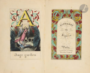 ALPHABET EN FIGURES. — J. Langlumé et Peltier. Rue du Foin St Jacques. 11. [Paris. 1840]. Imprimerie J. B. Gros. Rue du Foin St Jacques. In-12 (17,7 x 11,3 cm). 48 pp., (24) planches coloriées au pochoir : cartonnage de l’éditeur de papier...