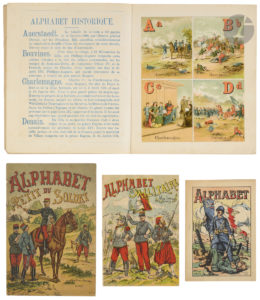 • Alphabet militaire. Mes livres favoris. [Epinal. Vers 1900]. In-12 (20,2 x 14 cm). (12) pp., couvertures de papier comprises, la première illustrée en couleurs, trois militaires, celui du centre portant le drapeau français.