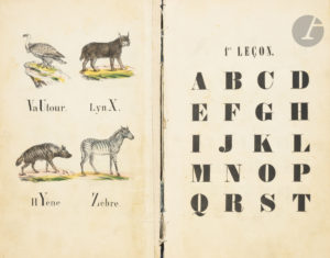 ALPHABET ILLUSTRÉ. — [Suivi de :] Lectures courantes. Joseph Scholz. Mayence. [Vers 1860 ?]. In-12 (17 x 10,7 cm). 32 pp., (6) pp. de planches / 16 pp., (13) pp. de planches : demi-toile à petits coins, plats de papier marbré. (Reliure...