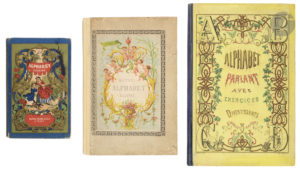 • Alphabet des fleurs. Deux planches d’après les dessins de Noël Eugène Sotain (1816-1874) et vingt-cinq planches de fleurs (sans le W), toutes coloriées au pochoir. Un texte se rapportant à la plante, à gauche, et illustration légendée, à droite. Alphabets et syllabes complètent l’ouvrage.