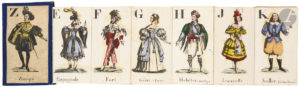 [ALPHABETS DES PERSONNAGES DES OPÉRAS BALLETS]. — Sans adresse, ni lieu, ni date. [France. Vers 1835]. (14,5 x 9 cm). Leporello de (23) planches coloriées au pochoir et rehaussées à la gomme arabique : cartonnage de l’époque de papier...