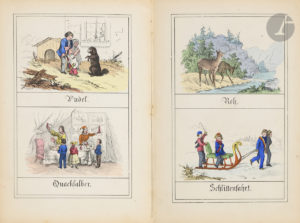 Abécédaire finement lithographié et colorié au pochoir, réalisation de la grande maison d’édition fondée par Jakob Ferdinand Schreiber en 1831.