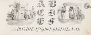 Puis à partir de la planche vingt-trois, débute un abécédaire illustré avec deux grandes initiales (y compris le W, les lettres doubles et l’esperluette) faisant partie d’un décor, dont de nombreuses sont issues de planches françaises signées par Victor Adam. Sans légendes, les initiales sont soulignées d’un texte ou d’une ligne d’alphabet. Dans la même mise en pages, suivent les chiffres jusqu’à douze. Prières et commandements précèdent une page de signes pour les marchands et les échanges commerciaux.