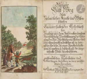 NEUER LUST-WEG ZUM ZIEL NÜTZLICHER KÜNSTE UND WISSENSCHAFTEN. [Nouveau chemin de plaisir vers les arts et les sciences utiles]. — Ein unterhaltendes Lehrbuch für Zöglinge aus dem Kindesalter, um ihnen durch bildliche Vorstellungen die Erlernung...