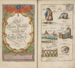 Soixante-huit planches finement gravées sur cuivre et coloriées à la main y compris deux titres ornés séparant les planches en deux parties. Chaque planche est divisée en six rectangles avec chacun une gravure légendée en allemand, écriture cursive (Sütterlin) et gothique, en latin, en italien et en français. (Sauf deux planches sur les animaux et oiseaux, une en quatre bandeaux verticaux, et légendées uniquement en allemand). Personnages, animaux, objets, éléments de la nature et architecturaux sont figurés avec la légende également gravée sur cuivre. Les légendes ne suivent aucun ordre alphabétique.