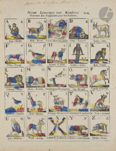 ♦ Rare planche d’abécédaire animalier, flamand-français, par une maison d’édition fondée en 1796 à Turnhout, à l’époque dans le département français des Deux-Nèthes.