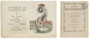 Ensemble complet de deux abécédaires hollandais en première édition et ornés, chacun, de sept planches gravées sur bois coloriées à la main.