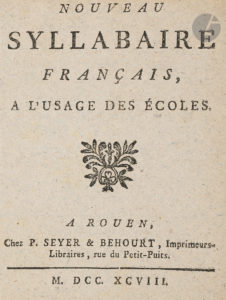 NOUVEAU SYLLABAIRE FRANÇAIS, À L’USAGE DES ÉCOLES. — Chez P. Seyer & Behourt, Imprimeurs-Libraires, rue du Petit-Puits. A Rouen. 1798. In-16 (12,1 x 10,2 cm). 30 pp., (1) f. blanc : couvertures de l’époque, de papier bleu, muettes.
