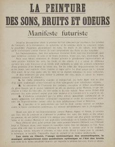 (25 mars 1912).- U. Boccioni. Manifeste technique de la sculpture futuriste. (11 avril 1912).- U. Boccioni (le même).- Auguste Joly. Le futurisme et la philosophie. (juillet 1912).- Ray Nist. La peinture futuriste en Belgique. (juillet 1912).- L. Russolo. L’art des bruits. Manifeste futuriste. (11 mars 1913).- C.D. Carrà. La peinture des sons, bruits et odeurs. (11 août 1913).9 manifestes (celui de Boccioni en double). Chaque : un feuillet, plié en deux 23 x 29 cm en pochette acétate ouvrante. Traces de plis mais bon état général.