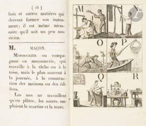 Pour chaque alphabet : quatre planches gravées, comprenant chacune six fines gravures détaillées, et un texte didactique pour chaque lettre illustrée.