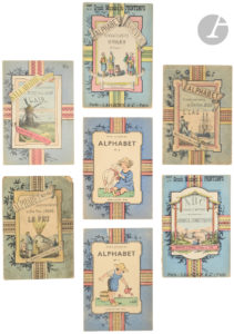 SYLLABAIRE NOUVEAU. ENSEIGNEMENTS DU BON PAPA JACOB. L’Air. — Imagerie d’Epinal. [Vers 1890]. In-12 (20 x 13,5 cm). (12) pp. : couvertures de papier lithographiées et coloriées au pochoir, un moulin, au centre de la première,...
