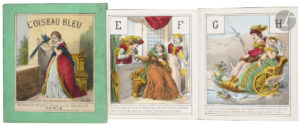 [AULNOY Madame d’]. [LEVILLY]. — L’Oiseau bleu. — Bernardin-Béchet, Editeur, Quai des Augustins, 31. Paris. [Vers 1855]. Lith. Badoureau. Paris. (15 x 13 cm). Leporello de (11) planches lithographiées, coloriées au pochoir : cartonnage...