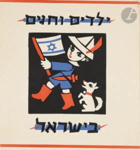 BARTOV (Mariam). HAMEIRI (Avigdor). — Yeladim ye-hagim beIsrael. — Sinaï Publishing. Tel-Aviv. [1957]. In-4 (24,5 x 23,3 cm). (24) pp. : cartonnage de papier crème linogravé en noir, rouge et bleu, sur le premier plat, un enfant et son...