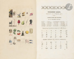 [Est jointe]. Une boîte romantique. [France. Vers 1830]. (9,2 x 15,2 x 3,7 cm). Titre lithographié en noir sur le couvercle de papier jaune : Le Quadrille des Enfants ou Système Nouveau de Lecture par Berthaud, avec un encadrement doré et gaufré, bords de papier jaune estampé de motifs floraux. Elle renferme, dans quatre compartiments, 84 fiches en os, 20 sont laissées blanches, 24 sont teintes en vert, 20 en rouge et 20 en jaune, elles comportent deux étiquettes appliquées sur chacune des faces.