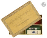 ♦ Extrêmement rare ensemble. La boîte de fiches en os, éclatante, rend la reliure postérieure de l’ouvrage un peu terne, mais l’ouvrage, avec ses planches coloriées, est parfaitement conservé.