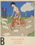 l’éditeur, dos de toile grise, plats de papier gris, lithographie en couleurs figurant une poupée de bois articulée, emmêlée dans les lettres ABCD orange et vertes, sur le premier, visage à moustache, au centre du second, accompagné du monogramme et du nom de l’artiste en pied.