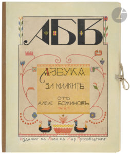 BOZHINOV (Aleksandur). — ABV Azbouka za malkite. [ABC Alphabet pour les petits]. — Izdanie na Min[isterstvo] na Nar[odnoto] Prosveshtenie. [Édition du Ministère de l’Éducation Nationale]. [Sofia]. 1921. Chemise de carton de l’éditeur...