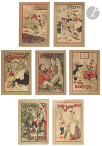 [BRODARD]. — Ensemble des sept abécédaires publiés par la maison M. Brodard à Montpellier. — Le Bon Dentiste. Mr & Mme Crépin. Voilà Jean-Bête. Tracasson. Pêchelinet. Petit Jean. La Mère Cognedur. — Maison M. Brodard, 9, rue des...