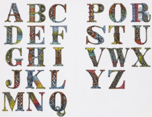 Vingt-six lettres faites avec des morceaux de la tour Eiffel. Dessins pour Le Petit Lexique de la tour Eiffel, pages 87 à 91, d’une finesse d’inventivité et de réalisation extrêmes.