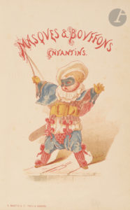 COINCHON (Albert). — Masques et bouffons enfantins. — Album alphabétique & artistique. A. Martin & C°. Paris & Londres. [Vers 1870]. In-4 (30 x 21,8 cm). 1 f. de titre, 1 f. de titre illustré, 26 planches lithographiées en couleurs :...