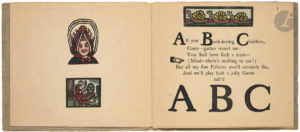 Abécédaire comportant plusieurs gravures sur bois coloriées par page, d’inspirations anciennes variées, disposées parmi les lettres de l’alphabet en très gros caractères, et couplets dédiés à chaque initiale.