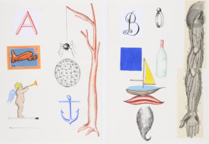 Dessins à l’encre de Chine, aquarelles, crayons de couleur, collages d’éléments divers, (estampes du Magasin Pittoresque, carte à jouer, étiquette de boîte d’allumettes soviétique). Planches rébus, planches d’associations d’idées et planches combinant les deux. L’initiale est dessinée sur un rectangle de bristol appliqué dans l’angle supérieur gauche et ses occurrences réparties de manière variée sur chaque planche.