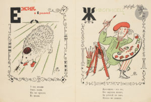 Dobouzhinsky nous offre son autoportrait pour la lettre J, Zhivopisets, le peintre, après l’acrobate, le scaphandrier, le hérisson et avant l’inventeur, le patineur sur glace, l’inondation, le glouton, l’autruche effrayée, le trouillard, l’Etna, etc.