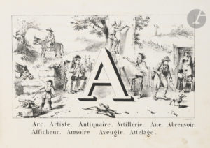 Alphabet peu courant. Vingt-cinq planches lithographiées par Henry Emy (1820-1874), dessinateur et lithographe, qui travaillait également pour ses ouvrages destinés aux enfants sous le nom de Télory.