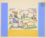 • La Petite bergère. [Tolmer. Vers 1925]. (22 x 27,6 cm). Planche coloriée au pochoir destinée à un couvercle de boîte.
